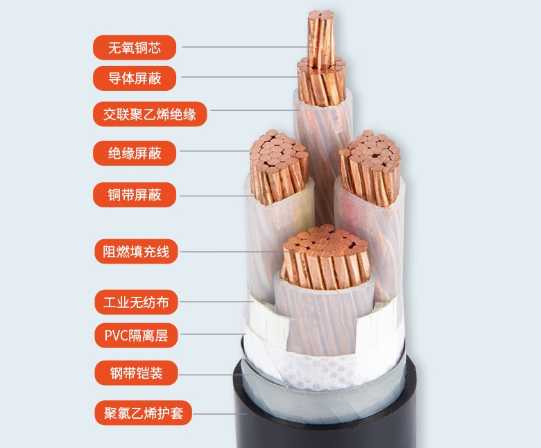 電力電纜的保護層分內護層和外護層兩部分。內護層主要是保護電纜統包絕緣不受潮濕和防止電纜浸漬劑外流以及輕度機械損傷;所用材料有鉛包、鋁包、橡套、聚氯乙烯套和聚乙烯套等。外護層是用來保護內護層的,防止內護層受機械損傷或化學腐蝕等,包括鎧裝層和外被層兩部分。所用材料,一般鎧裝層為鋼帶或鋼絲,外被層為纖維繞包、聚綠乙烯護套和聚乙烯護套。